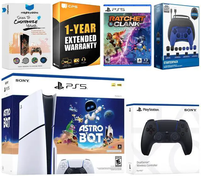 INCLUDED: Sony PS5 Disc, 2x Controllers, ASTRO BOT Download, Rachet and Clank Disc Game, Pro Gamer Kit, MightySkins code, CPS 1 Year Protection Plan
