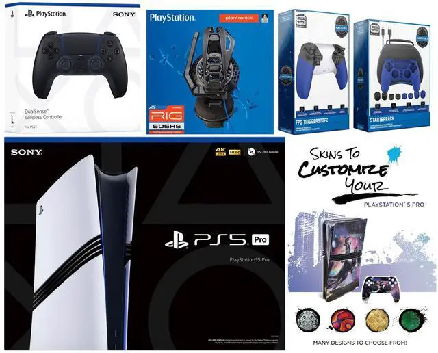 Sony PlayStation 5 Pro Console, 2x Dualsense Controllers, Plantronics RIG 505 HS Gaming Headset, Pro Gamer Starter Pack 11-Piece Accessory Kit, FPS Trigger Kit with Adjustable Stops, MightySkins Console + Controller Decal Code, HDMI cable, AC power cord, USB cable, and 2 Year Extended CPS Warranty
