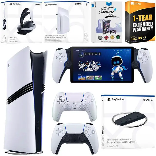 Sony PlayStation 5 Pro, 2x Controllers, Disc Drive Attachment, Vertical Stand, Pulse Elite Wireless Headset (White), PlayStation Portal, HDMI cable, AC power cord, MightySkins code and 1 Year CPS Extended Warranty