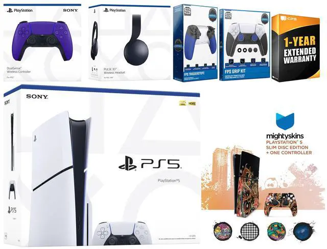 Sony PlayStation 5 Digital, 2x Controllers, Sony PULSE 3D Headset, FPS Grip Kit, Trigger Kit, MightySkins Code and 1 Year CPS Extended Warranty