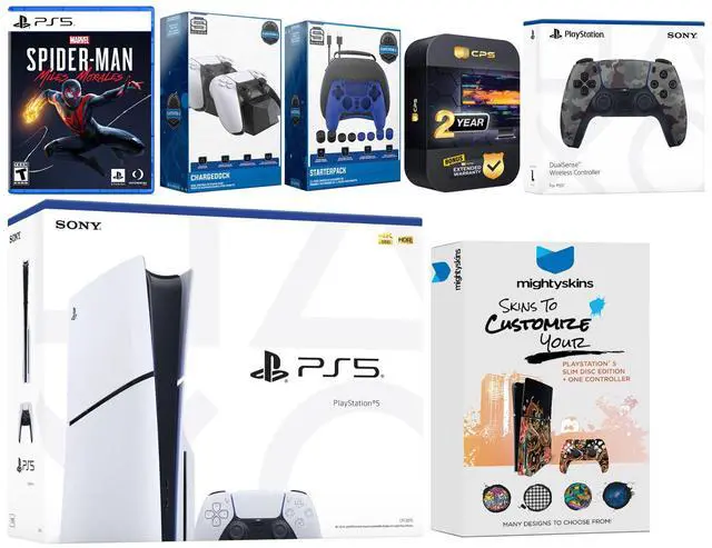 Spider-Man: Miles Morales Physical Game, Pro Gamer Starter Pack 11-Piece Accessory Kit, Dual Controller Charge Dock, MightySkins Console + Controller Decal Code, HDMI cable, AC power cord, USB cable, and 2 Year Extended CPS Warranty