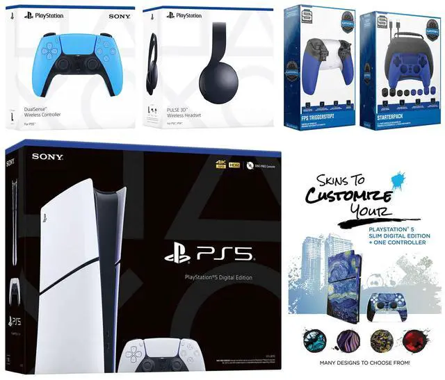 Sony PlayStation 5 Digital, 2x Controllers, Sony PULSE 3D Headset, Pro Gamer Starter Pack, FPS Trigger Kit, MightySkins Code, and 1 Year CPS Extended Warranty