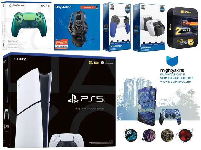 Sony PlayStation 5 Slim Digital Console, 2x Dualsense Controllers, Plantronics RIG 505 HS Gaming Headset, Trigger Kit with Adjustable Stops, Dual Controller Charge Dock, MightySkins Console + Controller Decal Code, HDMI cable, AC power cord, USB cable, and 2 Year Extended CPS Warranty