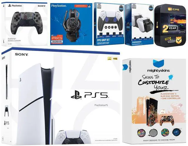 Sony PlayStation 5 Slim Digital Console, 2x Dualsense Controllers, Plantronics RIG 505 HS Gaming Headset, FPS Grip Kit with Precision Aiming Rings, Dual Controller Charge Dock, MightySkins Console + Controller Decal Code, HDMI cable, AC power cord, USB cable, and Warranty