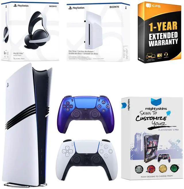 INCLUDED: Sony PlayStation 5 Pro Digital, 2x Controllers, Disc Drive Attachment, Pulse Elite Wireless Headset (White), HDMI cable, AC power cord, MightySkins code and 1 Year CPS Extended Warranty