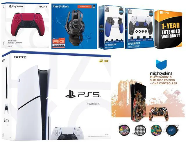 • INCLUDED: Sony PlayStation 5 Slim Disc Console, 2x Dualsense Controllers, Plantronics RIG 505 HS Gaming Headset, FPS Grip Kit with Precision Aiming Rings, FPS Trigger Kit with Adjustable Stops, MightySkins Console + Controller Decal Code, HDMI cable, AC power cord, USB cable, and Warranty