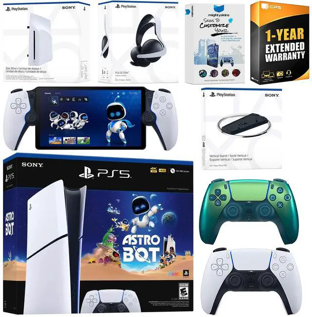 INCLUDED: Sony PlayStation 5 Digital, 2x Controllers, Astro Bot download, Pulse Elite Wireless Headset (White), Disc Drive Attachment, PlayStation Portal, Vertical Stand, HDMI cable, AC power cord, MightySkins Voucher and 1 Year CPS Extended Warranty