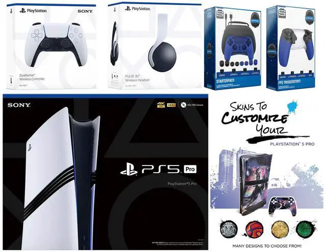 Sony PlayStation 5 Pro, 2x Controllers, Sony PULSE 3D Headset, Pro Gamer Starter Pack, FPS Trigger Kit, MightySkins Code, and 1 Year CPS Extended Warranty