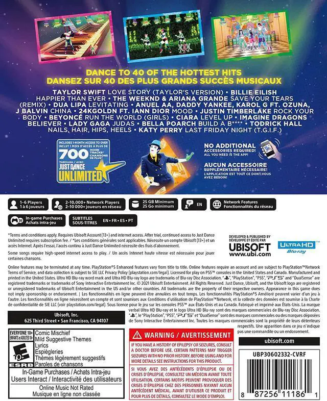 New exclusive songs featuring Just Dance all-time favorite tracks plus themed seasonal content are added throughout the year to make your experience even more fun! A free 1-month trail of Just Dance Unlimited is included with every copy of Just Dance 2022 on Nintendo Switch, PS4, PS5, Xbox Series X|S, Xbox One, and Stadia.