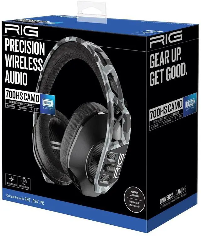 Designed for PlayStation, the RIG 700HS delivers wireless comfort with zero lag in an ultralightweight design. Weighing no more than 241 grams it is one of the lightest wireless headsets available. Featuring dual-material ear cushions, the RIG 700 HS provides hours of fatigue-free gaming. With 40 mm dynamic speaker drivers tuned specifically for the gaming audio, you can now react faster and more accurately as you can detect the distance and direction of your threats. RIG 700 HS Wireless PlayStation Gaming Headset for PS5, PS4, PlayStation, Nintendo Switch (docked), Mac & PC - Removable Mic, 40mm Speakers, 12 hour battery - Arctic Camo