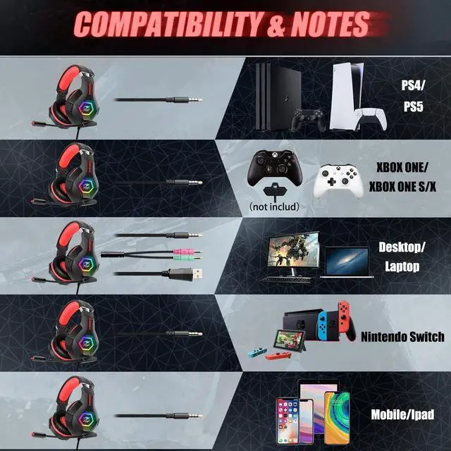 Our gaming headphones support perfectly Ps5, Ps4, Xbox Series X/S, PC, Switch, Laptop, Mac via the universal 3.5mm wired connection. (Please note you need an extra Microsoft Adapter (Not Included) when connect with an old version Xbox One controller.