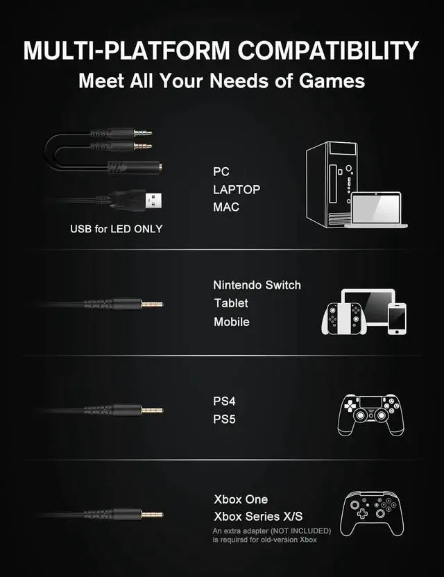 Plug the 3.5mm jack into your gaming device, it supports PlayStation 4, Playstation 5, Xbox One, Xbox Series S, Xbox Series X, PC, Mac