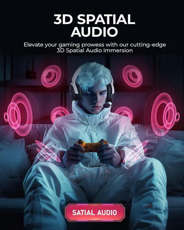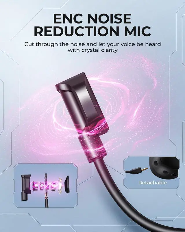 Detachable ENC Noise-Canceling Microphone & One-touch MuteKOFIRE headset equipped with a detachable 360° omnidirectional ENC microphone. Our wireless headset can accurately calculate the speaker's direction, preserving the target voice while eliminating background noise for improving call quality. Ensure your voice are relayed in high-definition clarity to your teammates. The microphone can be easily removed when not in use, making the headset more versatile for various activities like listening to music or watching movies. Moreover, the one-touch mute capability enables seamless transitions between gaming and other activities, ensuring gamers can focus on their tasks without interruption.
