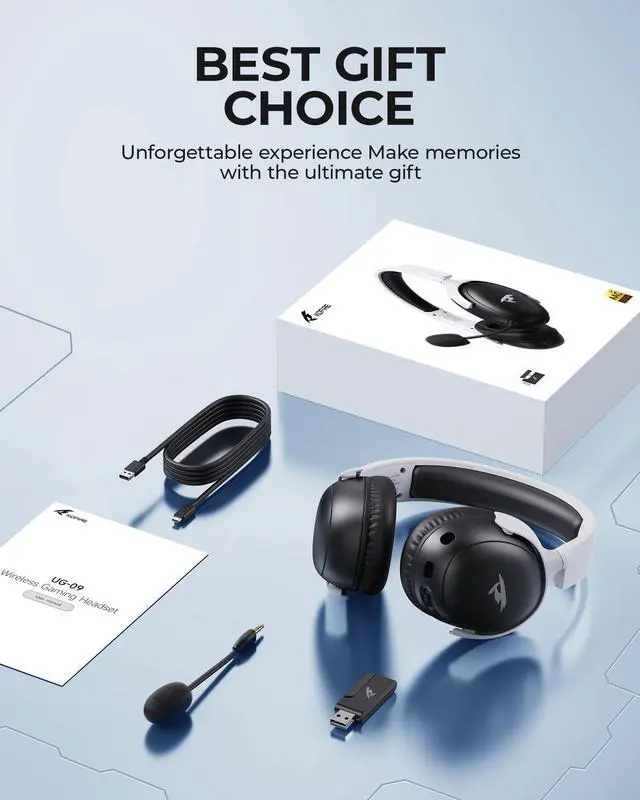 Wireless Gaming Headset, 2.4GH z USB Gaming Headphones with Bluetooth 5.4, 53MM 3D Stereo Sound, 65H Battery, ENC Noise Canceling Mic, 3.5 mm Wired, Black-White