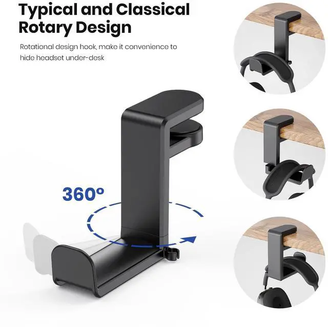 Rotating Adjustable Headphone ArmExperience effortless access to your headphones with 360-degree swivel design. The gaming headset stand makes it easy to get your desired directions, even tucking them neatly under your desk when not in use.