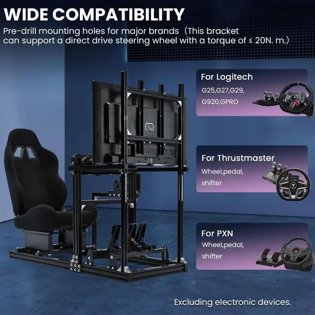 Compatible DevicesThis simulation racing cockpit fits for Logitech Pro Racing Wheel G29 G920 G923/Thrustmaster T500 T818 T80 T128 T300/Fanatec CSL-DD GT-DD-PRO/Moza R5 R9 R12 R16, PXN V9 and most popular Compatible with brands