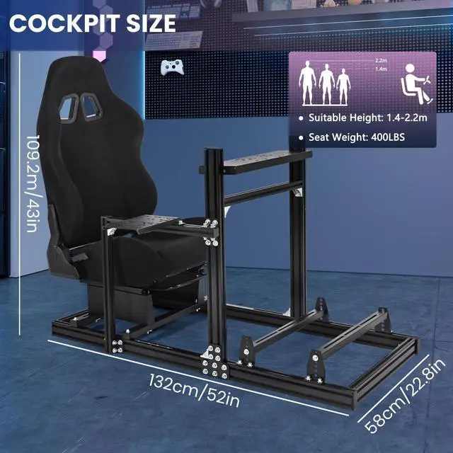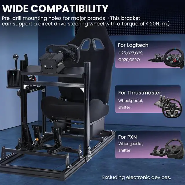 Compatible DevicesThis simulation racing cockpit fits for Logitech Pro Racing Wheel G29 G920 G923/Thrustmaster T500 T818 T80 T128 T300/Fanatec CSL-DD GT-DD-PRO/Moza R5 R9 R12 R16, PXN V9 and most popular Compatible with brands