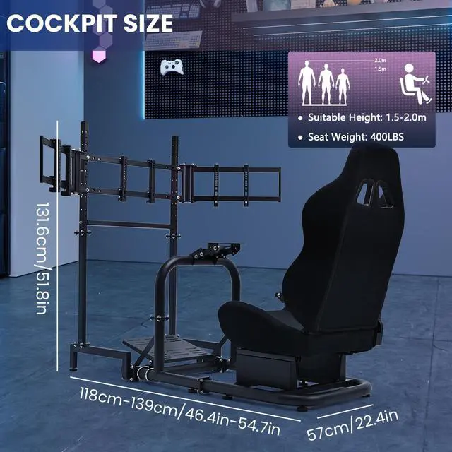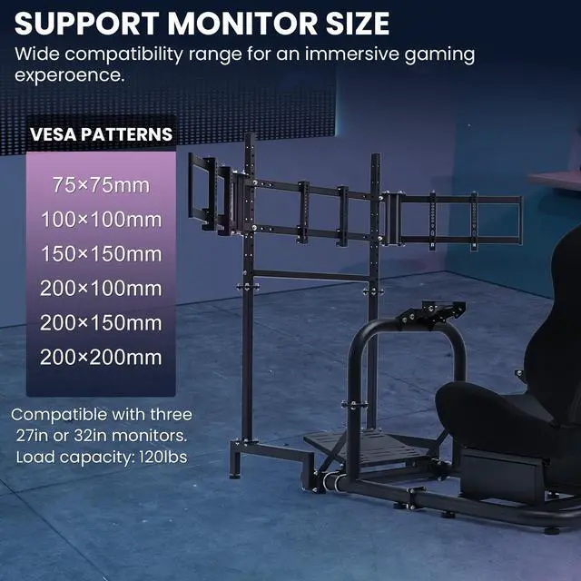 • Monitor Stand with Broader PerspectiveThis TV mount is capable of holding 3 screens to create the most realistic visual environment. The angle and height is adjustable to let you find the optimal driving posture