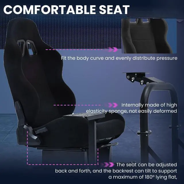 Wear-resistant Black SeatThis racing seat features a double-locking, dual-rail design, allowing smoother and more precise adjustments. This black chair is made of highly-breathable velvet with memory foam to keep it from deform