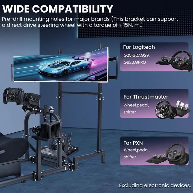 High AdaptabilityRacing sim stand adapts to direct drive steering wheel which will provide superior control and Stable gaming experience. This cockpit is compatible with mainstream brands, such as Logitech/Thrustmaster/Fanatec
