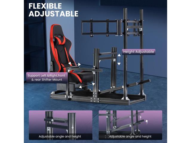 - Fully Adjustable:The racing simulator cockpit stand is fully adjustable.Both the stand itself and accessories such as the steering wheel, pedals and seat are adjustable. It fully satisfies the demands of all professional