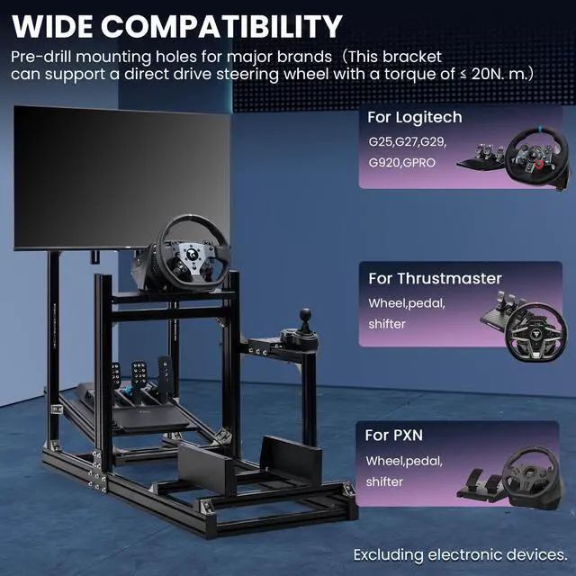 Wide CompatibilityThis sim racing cockpit can be adapted to most of the popular brands, fit for Logitech Pro Racing Wheel G29 G920 G923, Thrustmaster T500 T818 T80 T128 T300, Fanatec CSL-DD GT-DD-PRO, Moza R5 R9 R12 R16, PXN V9 and so on.