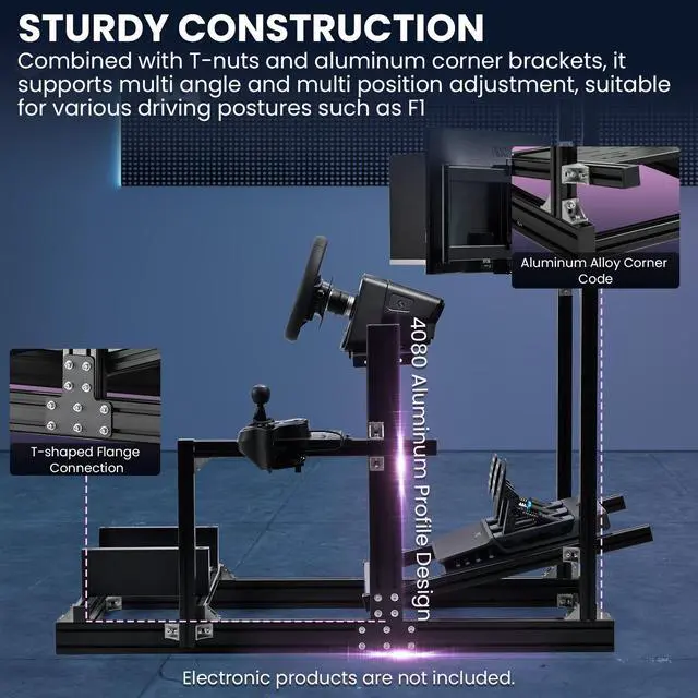 Fully Adjustable: The racing simulator cockpit stand is fully adjustable. Both the stand itself and accessories such as the steering wheel, pedals and seat are adjustable. It fully satisfies the demands of all professional.