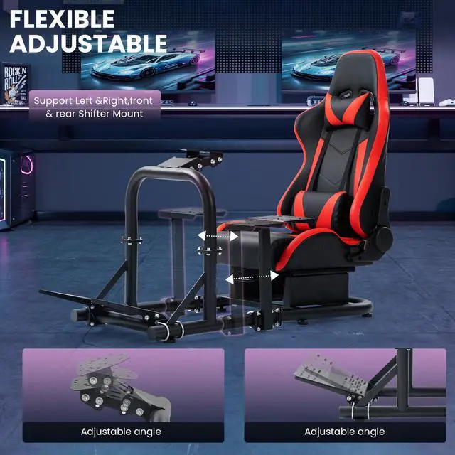 Adjustable Height and Angle:The steering wheel angle and pedal angle of the racing cockpit are adjustable. Adjustable pedal angle: 2.5-32.5°. Steering wheel angle: 0-40°. Shift lever is interchangeable on the left and right side
