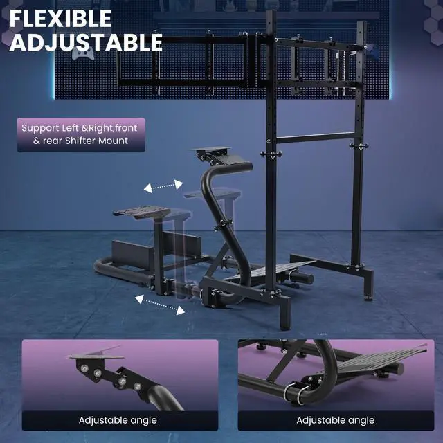 Triple-Screen Immersion, True Racing Cockpit: Supports three 27"/32" monitors for panoramic views. Build your ultimate immersive racing environment. Easily adjust screen angles and height to achieve the perfect driving posture