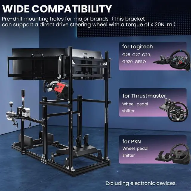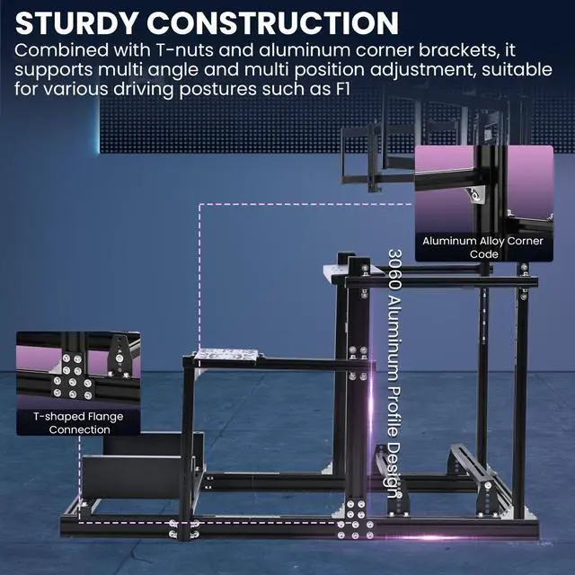 Robust and DurableThis cockpit is constructed with 3060/3030 T-slot aluminum alloy and laser-cut steel brackets, delivering industrial-grade stability. It reliably supports direct-drive wheels up to 20 Nm of torque, providing an extremely immersive and rigid racing experience