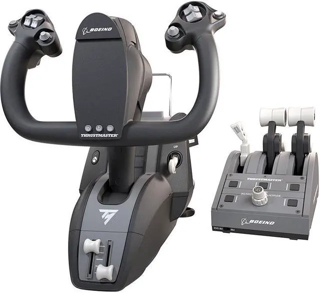 Experience the authenticity of commercial aviation with the Thrustmaster TCA Yoke Pack Boeing Edition. This flight control system is a 1:1 scale replica of the Boeing 787 yoke, designed for both PC and Xbox (One and Series X|S). With a solid metal frame and 150° wheel rotation, the yoke offers unmatched durability and precision, ideal for aviation enthusiasts looking to replicate real-life flight experiences. The TCA Yoke features H. E. A. R. T. magnetic sensor technology for enhanced accuracy, ensuring every control movement is registered smoothly and with precision.
