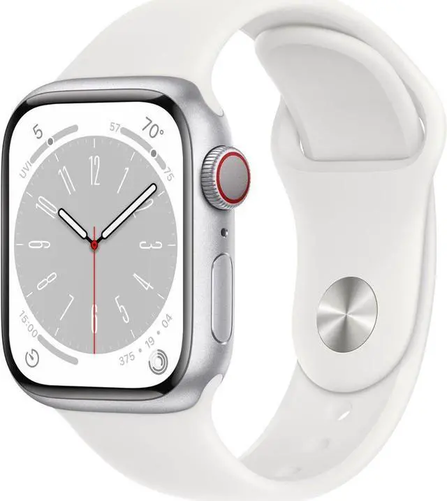 The Apple Watch Series 8 is an advanced health and safety smartwatch featuring a bright, always-on Retina display, temperature sensing for cycle tracking, Crash Detection, and an ECG app. It is available in 41mm and 45mm sizes, is water-resistant up to 50 meters, dust-resistant to IP6X certification, and offers all-day 18-hour battery life with a low power mode to extend it.