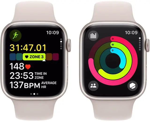 The Watch Series 9 41mm (GPS only) pairs a compact aluminum case with an Always-On Retina OLED display that reaches up to 2,000 nits - time, workout data and notifications stay easy to read in bright conditions. Its S9 SiP chip, third-generation optical heart sensor and precision GPS tracking make it an indispensable tool for workouts, navigation and everyday health tracking.