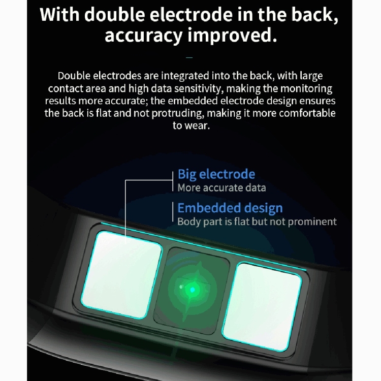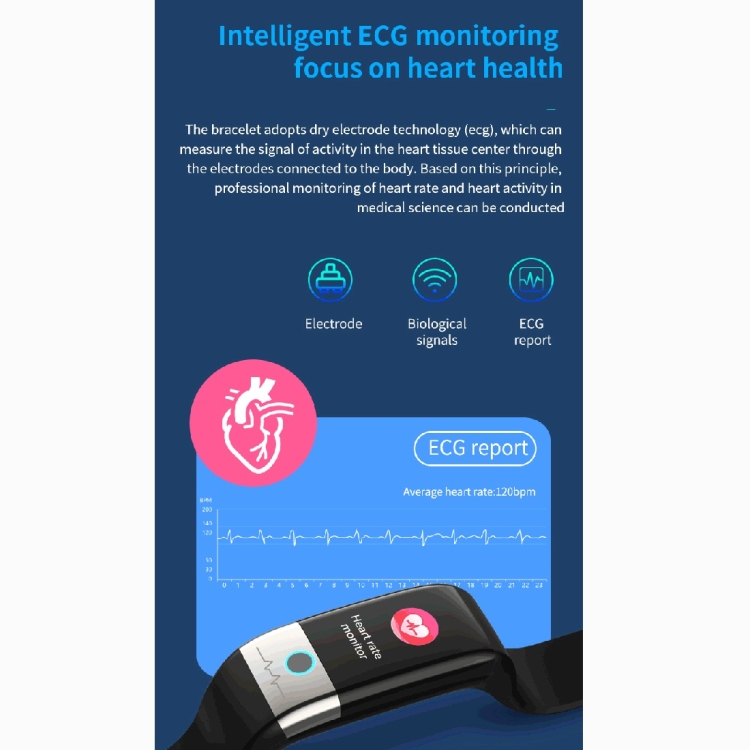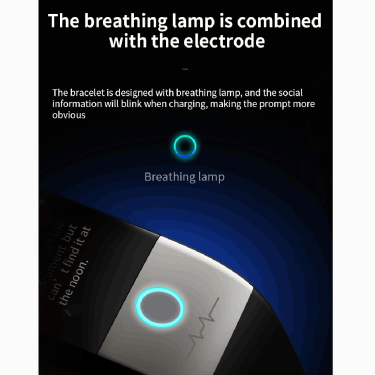 16. 1.08-inch ECG bracelet with larger display area and higher resolution. Support charging, information reminds the function of breathing light, more scientific sense. (Switching machine, call reminder, SMS reminder, social reminder and flashing when charging)
