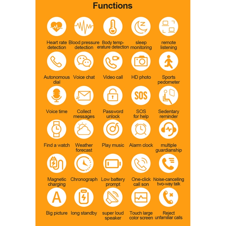 13. Functions: time zone calibration, sleep default manual collection and positioning, fixed upload, low battery alarm, electronic fence alarm, SOS alarm, video call, contacts, dial function, micro chat, heart rate and blood pressure monitoring, body temperature measurement, sleep monitoring , unlock password, take pictures, voice time, step counting, sedentary reminder, weather forecast, refuse to answer calls from strangers, alarm clock, remote shutdown, remote monitoring, historical track, multiple monitoring, firmware upgrade