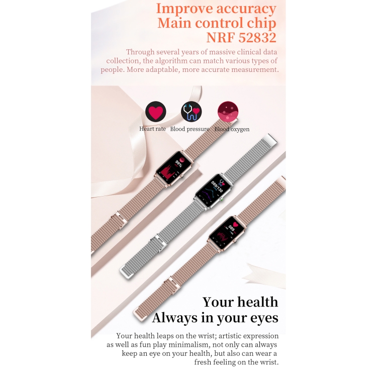 15. Functions: heart rate detection, blood oxygen detection, blood pressure detection, female menstrual period, time display, step counting, calories, distance, heart rate, sleep time, switch display, 12 sports modes (running/walking/hiking/badminton/ Rope skipping / exercise / yoga / aerobics / spinning / elliptical machine / rowing machine / swing), sleep monitoring (sleep time, sleep quality), call notification, information reminder, multi-language push, alarm clock reminder, sedentary reminder, etc.