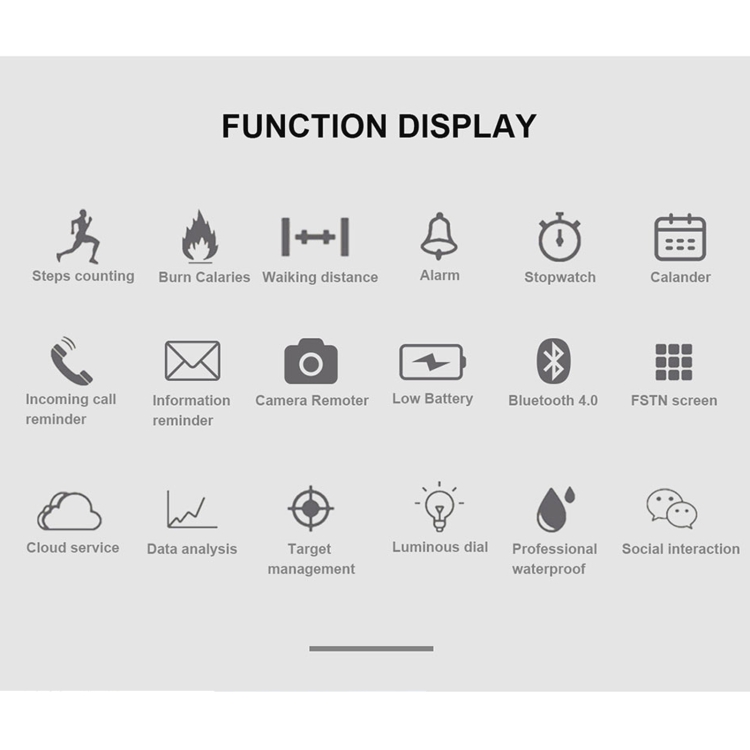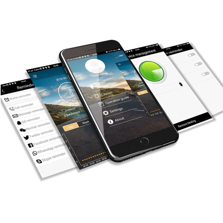 7. Function: exercise record (pedometer, calorie burn, mileage), exercise data storage: 7 days on the watch, long-term APP. Information Push: Push notifications for incoming calls, QQ, WeChat, SMS, Facebook Twitter, etc. (The phone or information sign on the dial flashes) Alarm clock, stopwatch, remote camera, Bluetooth music, mobile phone search, weather reminder, etc.