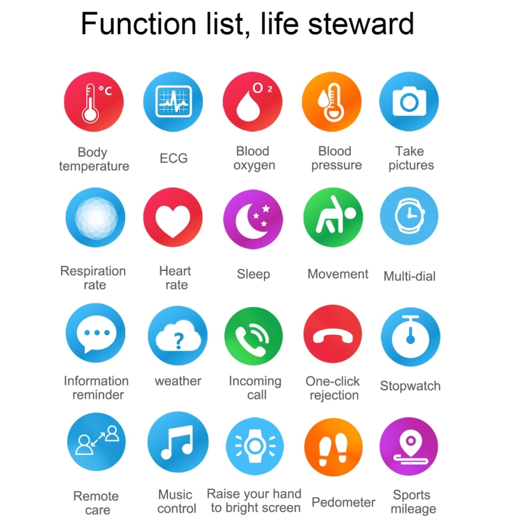16. Function: Multi-sports mode, heart rate monitoring, blood pressure monitoring, ECG function, AI medical diagnosis, body temperature monitoring, blood oxygen monitoring, breathing rate, remote care of relatives and friends, shake to take pictures, information reminder, music control, stopwatch, step counter Wait