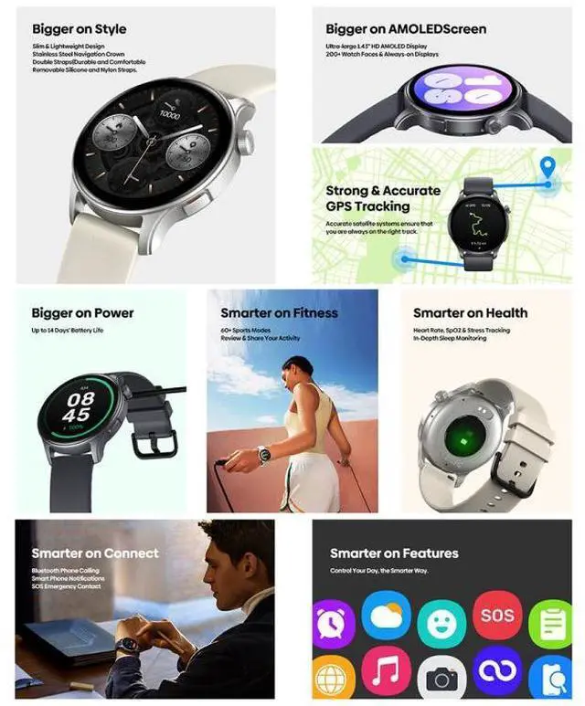 1. Activity tracking: activity record, pedometer, stand, move bar (displayed on the device after a period of inactivity; reset by walking for a few minutes), automatic goal (learns your activity level and assigns a daily step goal), calorie consumption, real-time pace and distance