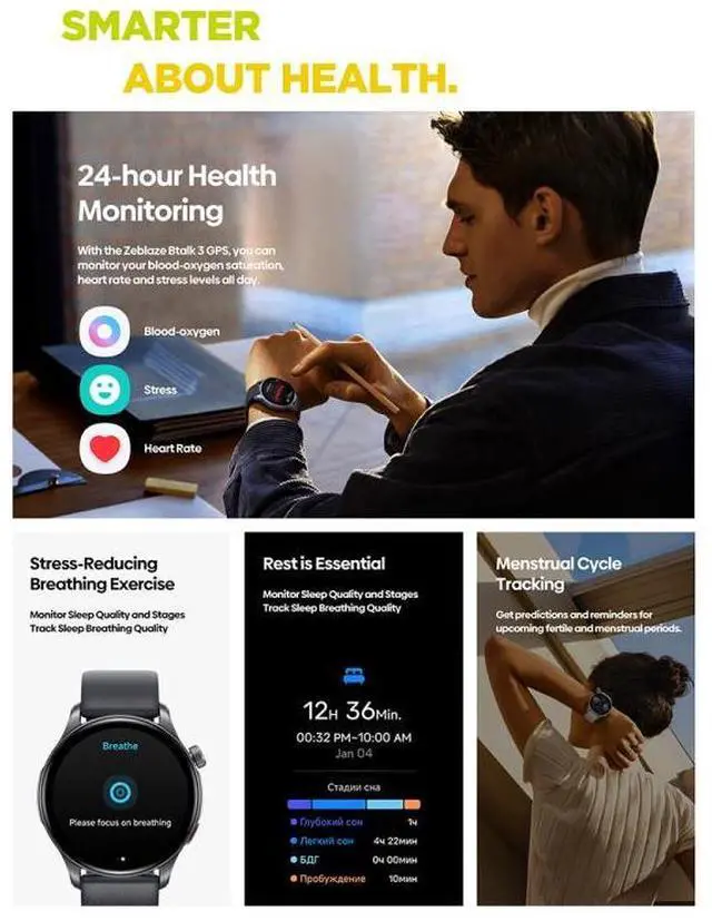 3. Manual measurement: wrist heart rate, SpO2 (blood oxygen) level measurement, stress level, female cycle tracking, breathing training