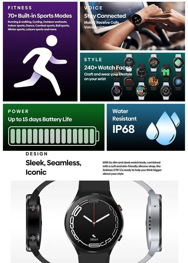 4. Health monitoring: On-wrist skin temperature monitor, wrist-based heart rate (constant, every minute., daily resting heart rate, abnormal heart rate alerts, spO2(blood Oxygen. Level measurement, women health, respiration rate, breath training, sleep score and Insights, calorie burn tracking.