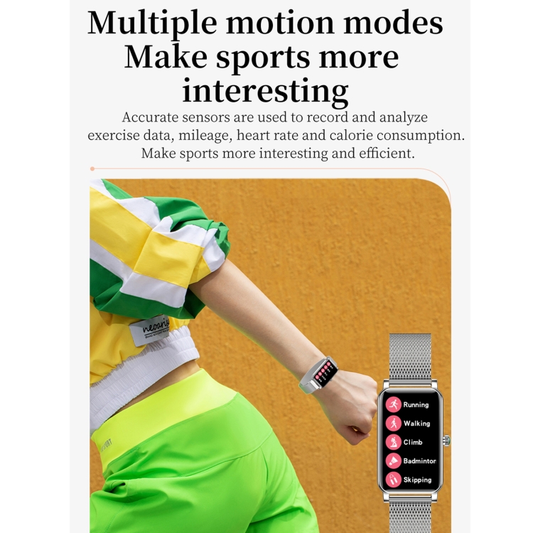 15. Functions: heart rate detection, blood oxygen detection, blood pressure detection, female menstrual period, time display, step counting, calories, distance, heart rate, sleep time, switch display, 12 sports modes (running/walking/hiking/badminton/ Rope skipping / exercise / yoga / aerobics / spinning / elliptical machine / rowing machine / swing., sleep monitoring (sleep time, sleep quality., call notification, information reminder, multi-language push, alarm clock reminder, sedentary reminder, etc.