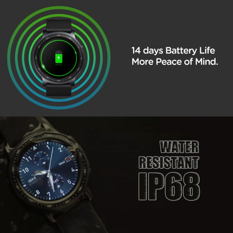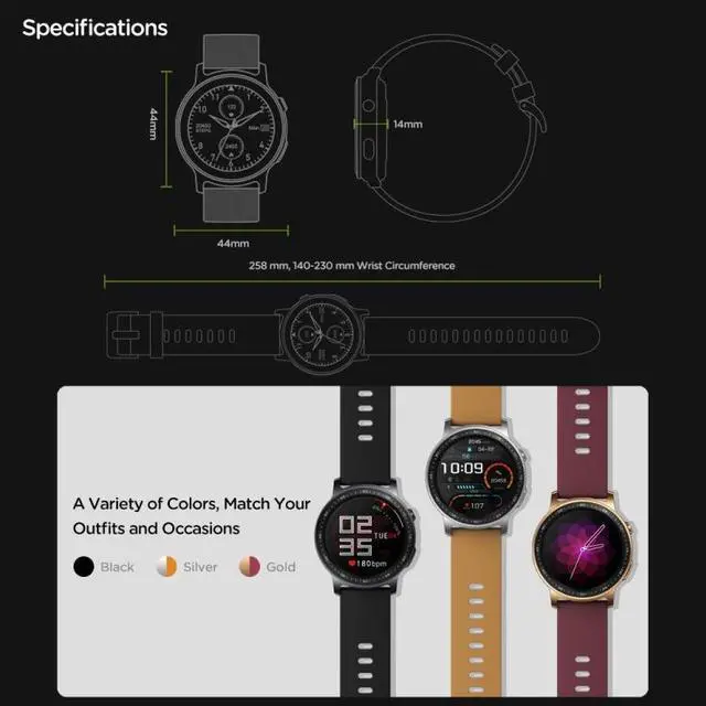 13. Functions: time/date, alarm clock, timer, stopwatch, daily resting heart rate, abnormal heart rate alert, SpO2 level measurement, blood pressure monitoring, sleep score and insight, calorie burn tracking, smart notification, weather, control smartphone Music, Find My Phone, Find My Watch, Do Not Disturb Mode, Mobile Reminder, Pedometer, Mobile Bar (displayed on the device after a period of inactivity; reset by walking for a few minutes), automatic target (understand Your activity level and specify your daily step goal), real-time pace & distance, sports mode (outdoor running, cycling, skipping rope, badminton, table tennis, tennis, climbing, walking, basketball, football, baseball, volleyball, board Ball, rugby, hockey, dance, spinning, yoga, sit-ups, indoor running, gymnastics, rowing, jumping), etc.