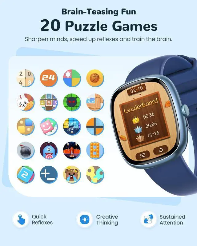 20 Games & Parental Controls Combine fun and learning with 20 puzzle games designed to improve logic, memory, and coordination. Parents can manage screen time, control app access, and set movement reminders to encourage active play
