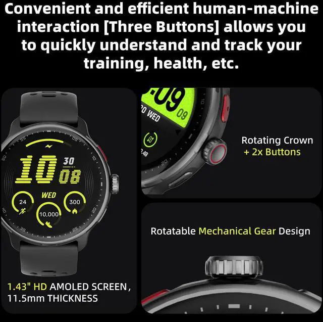 1.43" AMOLED Screen: The fitness tracker with 466×466 HD resolution and 850-nit peak brightness deliver sharp, colorful visuals even under direct sunlight. Customizable always-on display ensures access to time and fitness stats without lifting your wrist. 50Hz+ touch sampling rate ensures fluid swiping and tapping for seamless navigation. Interactive and Engaging Rotating Crown 2x Buttons meet your operational needs. You can also use your photos as the background of your watch in "Fitbeing".