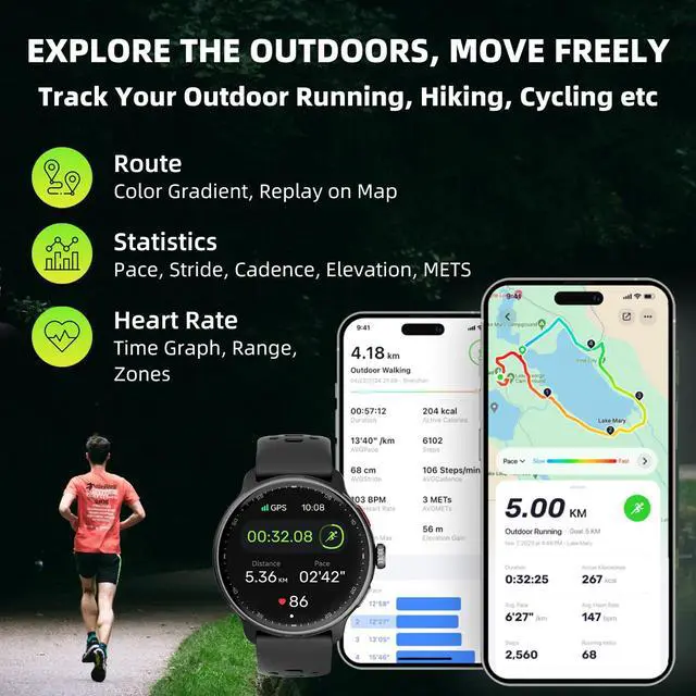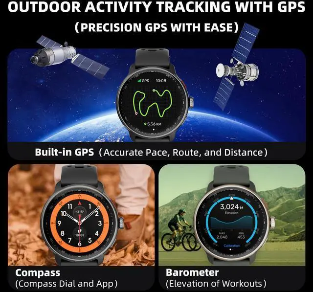 High-Accuracy GPS Tracking and Outdoor Navigation (Real-Time Elevation & Compass): Powered by a single-frequency GPS module, the CW Watch R3G Smartwatch ensures precise location tracking for runners, hikers, and cyclists. The sport watch built-in altimeter and compass provide essential data for outdoor adventures, helping users navigate trails and monitor elevation changes. The fitness watch is perfect for adventurers who demand reliable navigation.