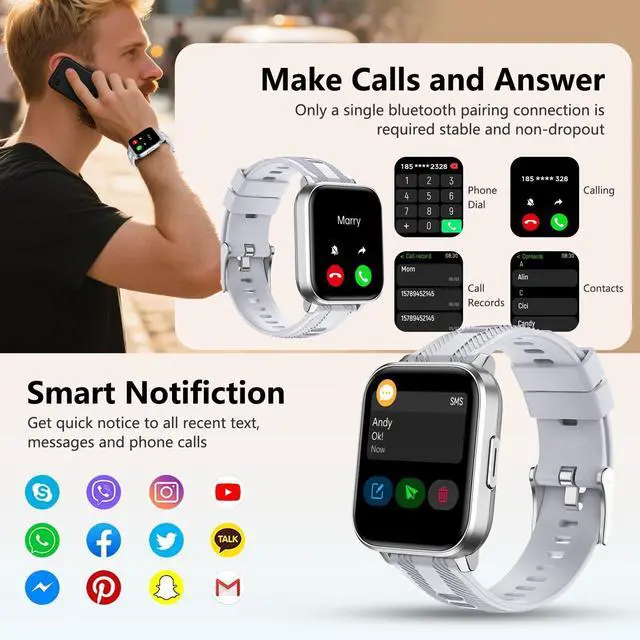 Bluetooth call and Message NotificationWhat sets our Smart Watch apart is its innovative message reply feature, enabling you to respond to texts swiftly and conveniently, all without the need to reach for your phone.This state-of-the-art smart watch offers Bluetooth calling capabilities, allowing you to engage in hands-free conversations directly from your wrist
