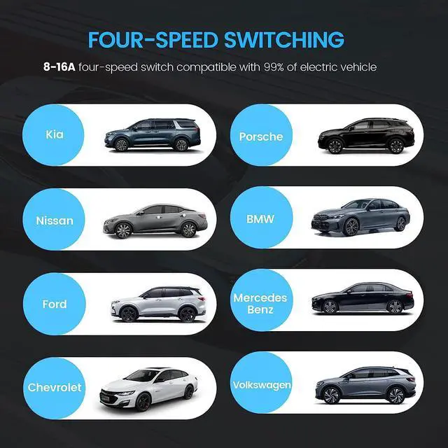Utilizing the standard J1772 charging protocol, this electric vehicle charger is compatible with all electric cars and plug-in hybrids. The Level 2 portable ev charger also have 2 kinds of cable length 16.4ft and 32.8ft available, which is long enough for most driveways or garages.