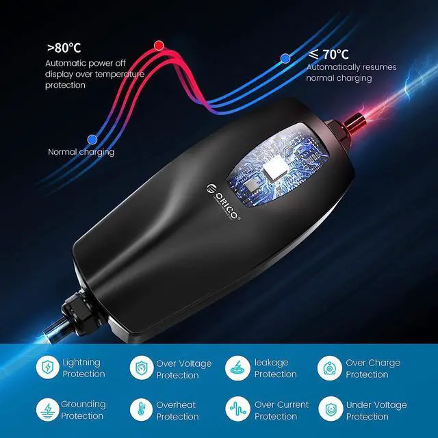 RELIABILITY TO THE FULLSET - Our Multi-detection System in ORICO level 2 ev charger can detect all aspects of the charging progress, including overheating, current overflow, power surge, low voltage, power overload, leakage to ensure safety and protection. IP66 waterproof connector and control mox, not afraid of rain and moisture.