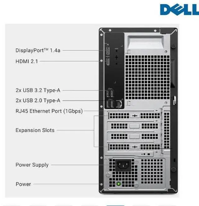• [Ports and Slots] Media Card Reader, Headset Jack, 4x USB 2.0 Type-A, 1x USB 3.2 Type-A, 1x USB 3.2 Type-C, DisplayPortTM 1.4a, HDMI 2.1, 2x USB 3.2 Type-A , 1x RJ-45 Ethernet Port (1Gbps), Kensington Slots